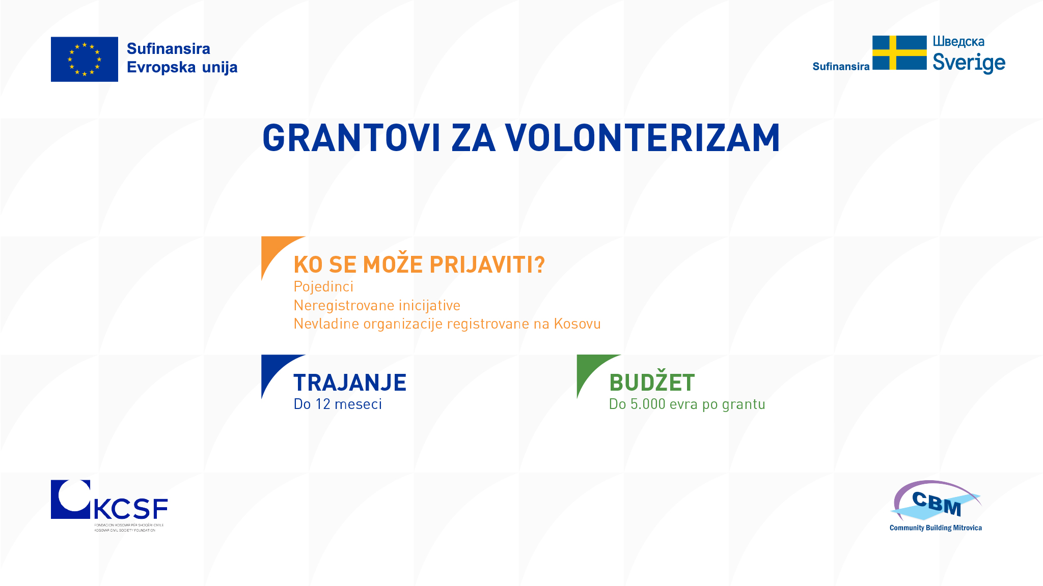 Ovu aktivnost sufinansiraju Evropska unija i Švedska. Njen sadržaj je isključiva odgovornost Kosovske fondacije za civilno društvo (KCSF) i Community Building Mitrovica (CBM) i ne odražava nužno stavove Evropske unije ili Švedske.